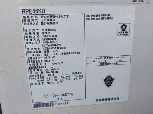 朝来市石田 東陶機器石油給湯機付ふろがまRPE46KD→ノーリツ石油給湯機付ふろがまOTQ-4706SAY 給湯器交換工事
